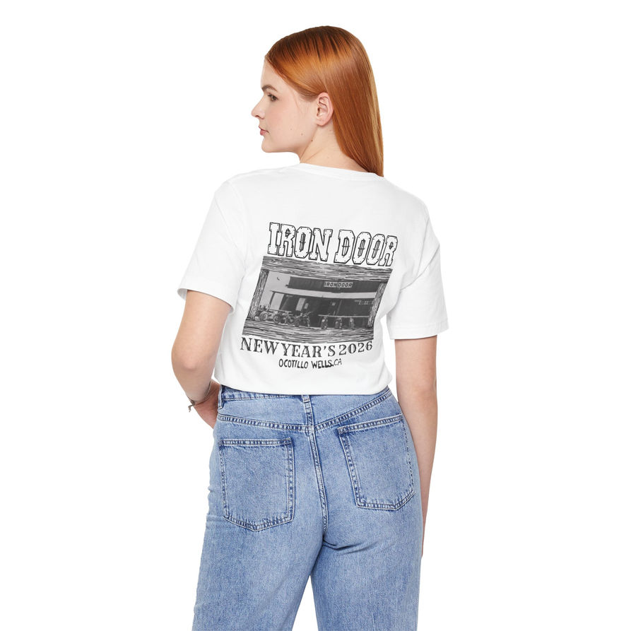 This lightweight jersey tee carries a lived-in, desert-bar vibe — soft, breathable cotton with a subtle chest logo and a bold back print that reads “IRON DOOR” above a vintage storefront photo and “NEW YEAR'S 2026.”